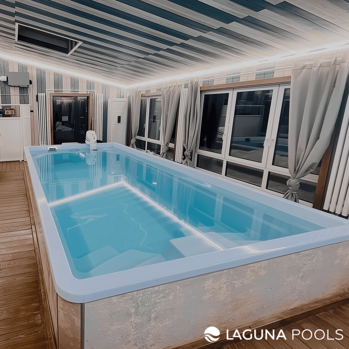 Прямоугольный композитный бассейн расположена в помещении с деревянным полом и синими стенами.